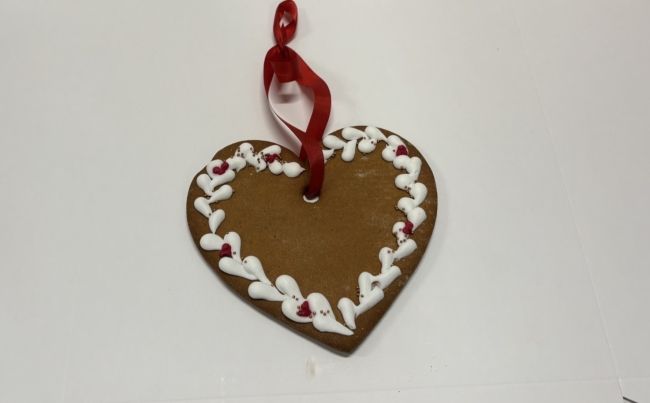 Dekorerat Peppakakshjärta med kristyr och sidenband
